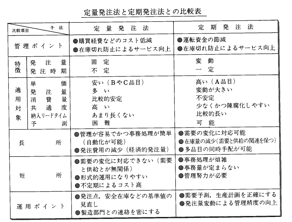 在庫管理手法を発注の観点から捉えると、定量発注法と定期発注法の2つに分けることができる。このどちらの方式も安全在庫を常備する点においては同じである。しかし、発注量と発注時期についてみると、定量発注法は、一定の量を発注するが、その時期は不定であり、発注点を基準にすることから発注点手法などとも呼ばれている。これに対し、定期発注法では、一定の時期を決めておいて、その時期に発注するが、発注量は不定である。これらはまた、統計的在庫管理手法とも呼ばれ、発注の基準となる量や期間を、過去の使用実績を基に設定し運用・管理する方法である。この管理手法の主な特徴は、管理対象となっている品目を個々独立に管理することにある。